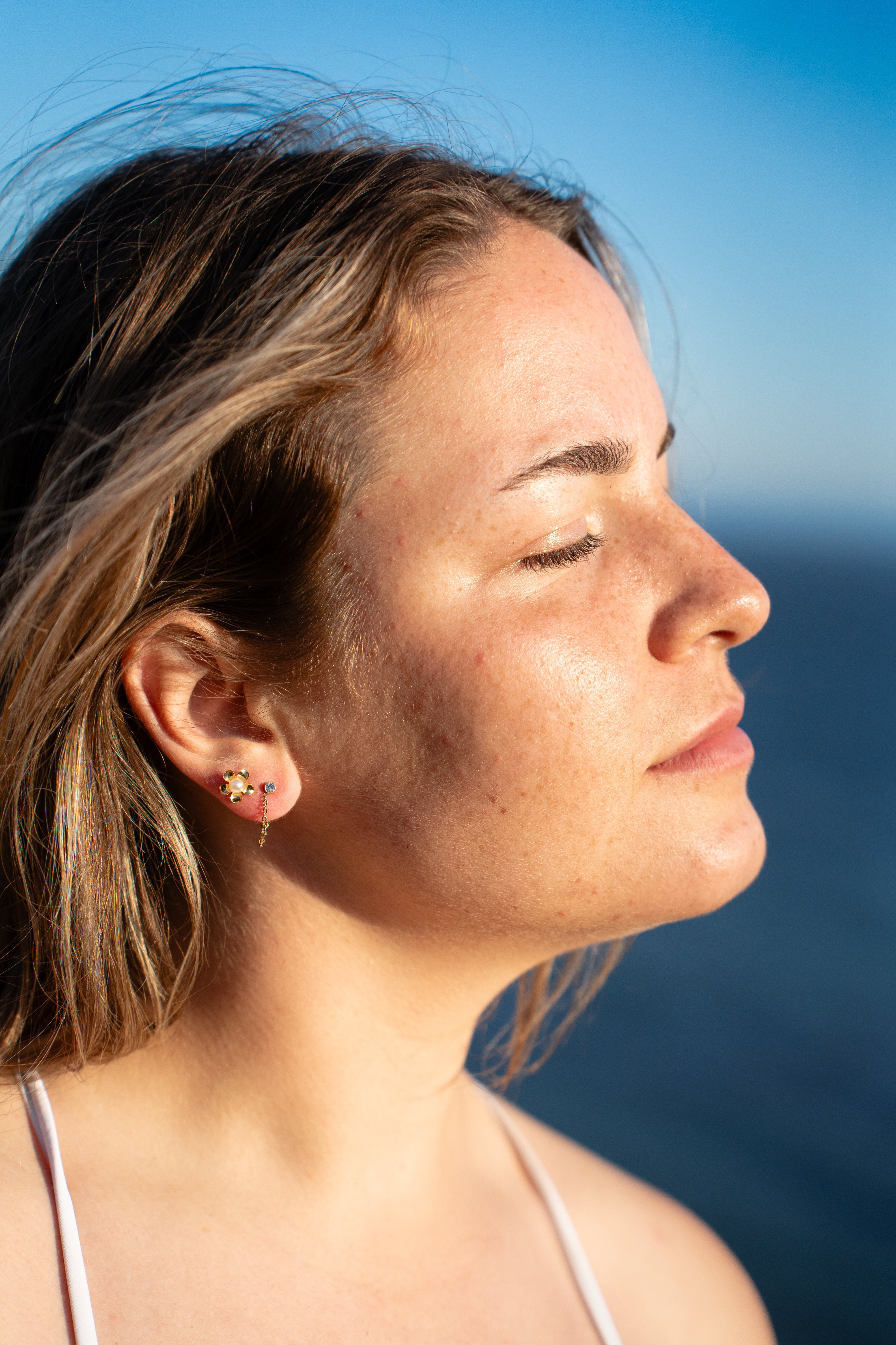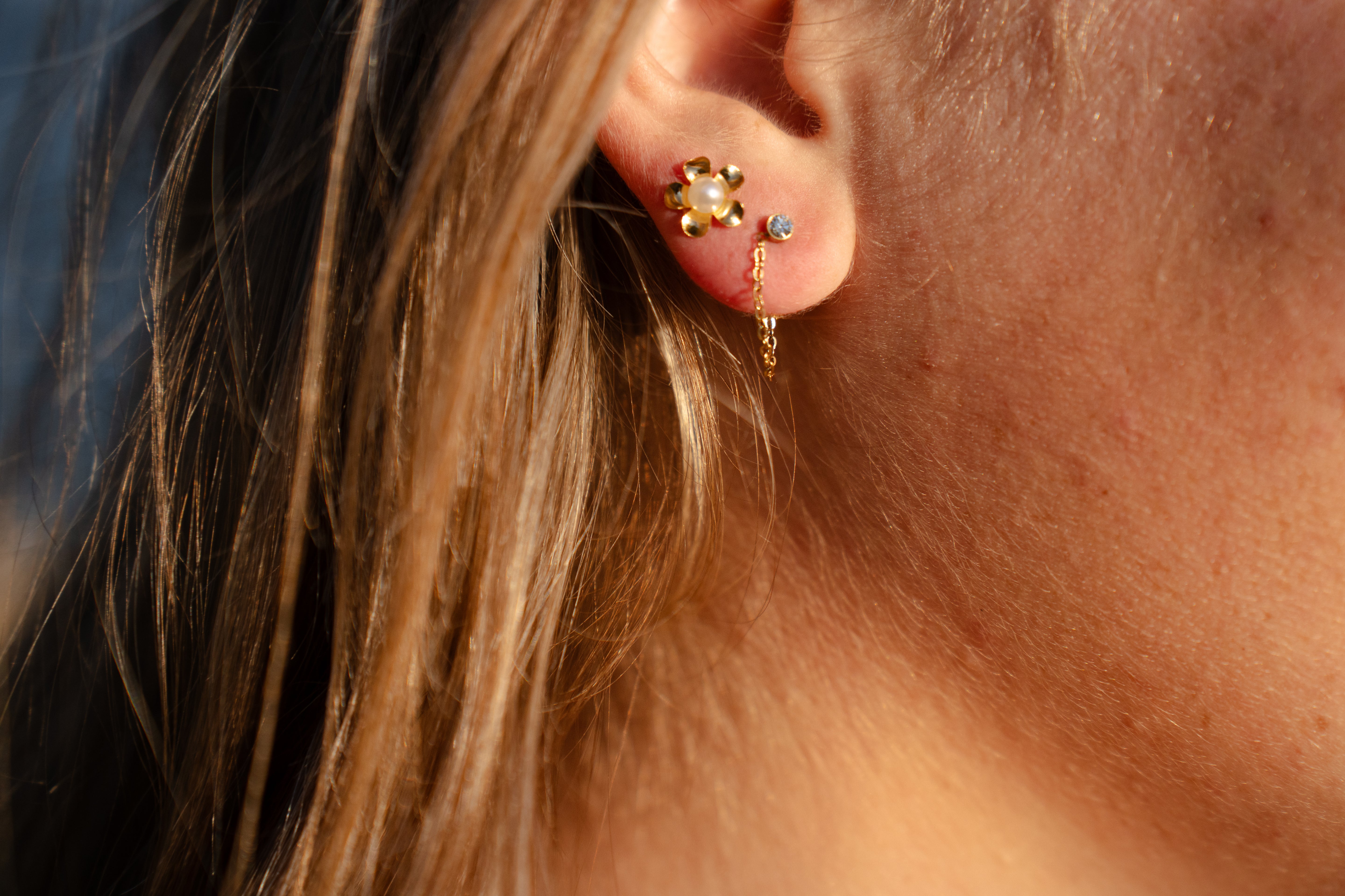 Delicate but unexpected — the Drift Chain Stud adds just the right edge. A bezel-set cubic zirconia catches the light at the lobe, while twin chains create a subtle sway with every move. Minimalist, modern, and totally ocean-girl approved.