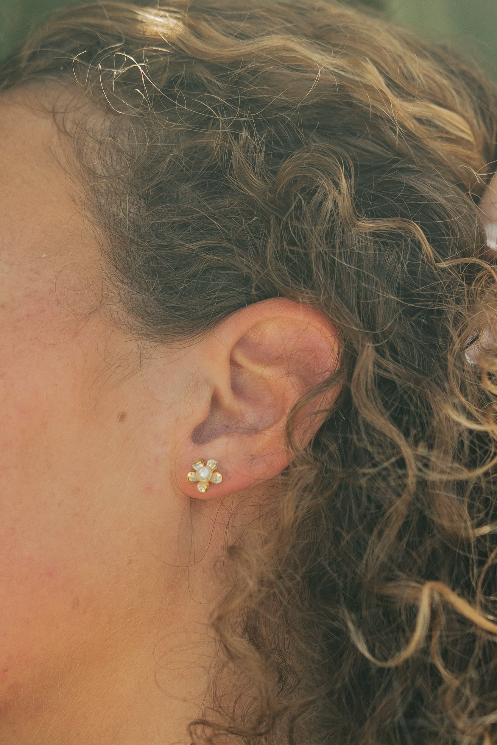 A tiny bloom with big charm. This flatback stud features a delicate flower design centered with a luminous pearl—like a seashell holding a secret. Waterproof, tarnish-free, and perfect for everyday wear, even in the surf. Wear it solo for subtle sparkle or stack it with your favorite studs.